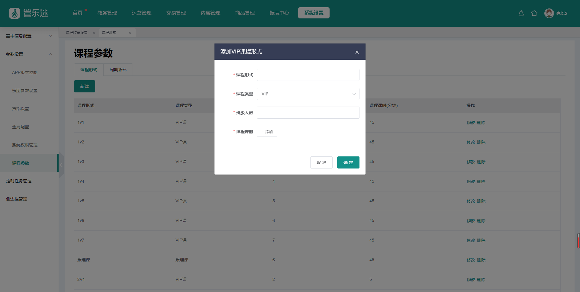 1、【系统设置】-【参数设置】-【课程参数】中设置VIP/乐理课每种模式下课程的班级人数和课程时长